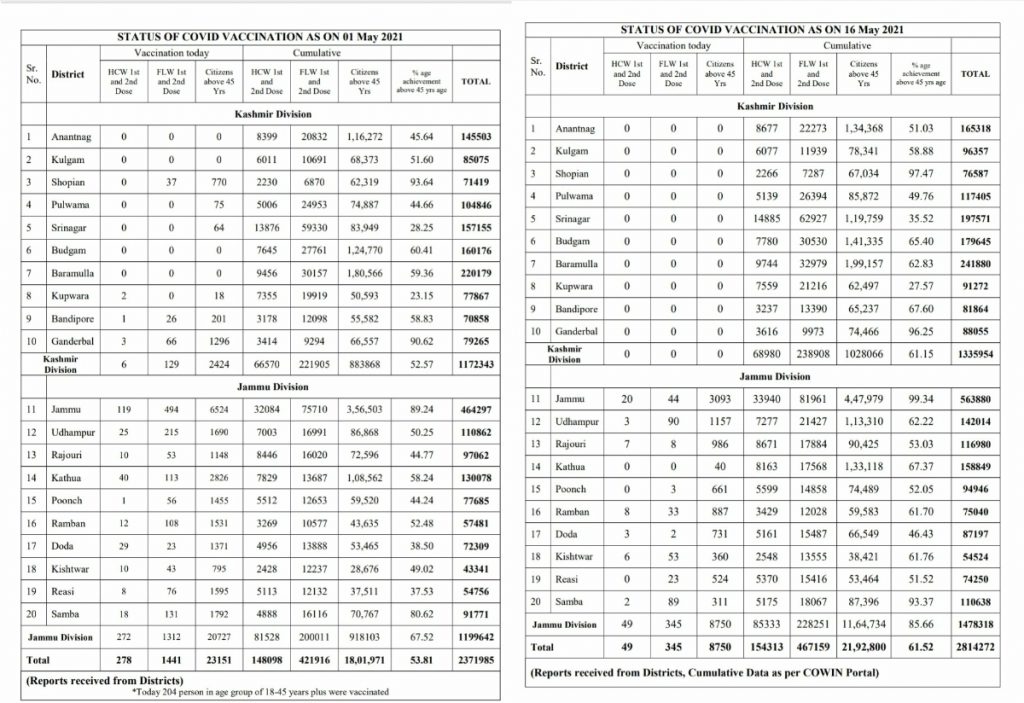 Until May 1, Kashmir and Jammu had administered 11.72 lakh and 11.99 lakh vaccination doses respectively. By then, Kashmir had inoculated 52.57% of its population above 45 years as compared to Jammu’s 67.52%.