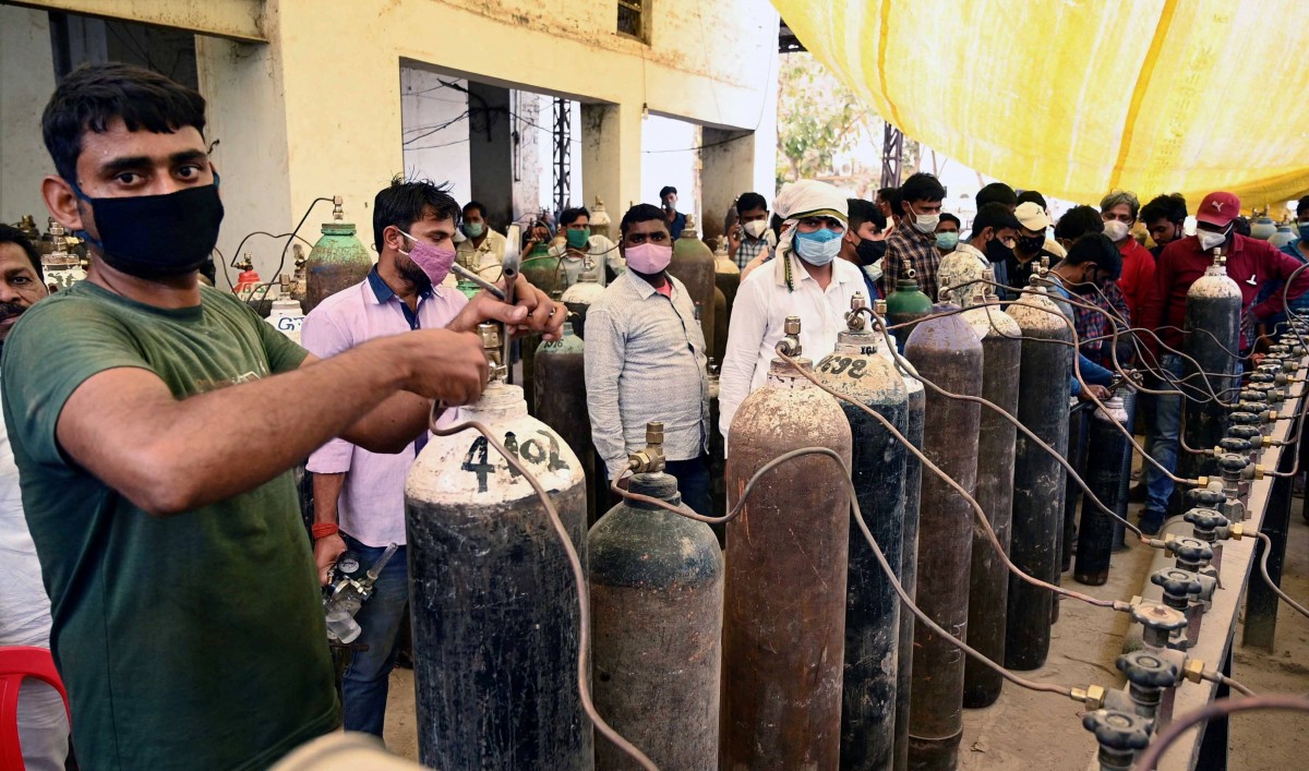 Family members of COVID 19 patient in queue to take cylinder filled with medical oxygen at a plant as coronavirus cases surge across the country, in Prayagraj on Tuesday, April 20, 2021. Photo: PTI