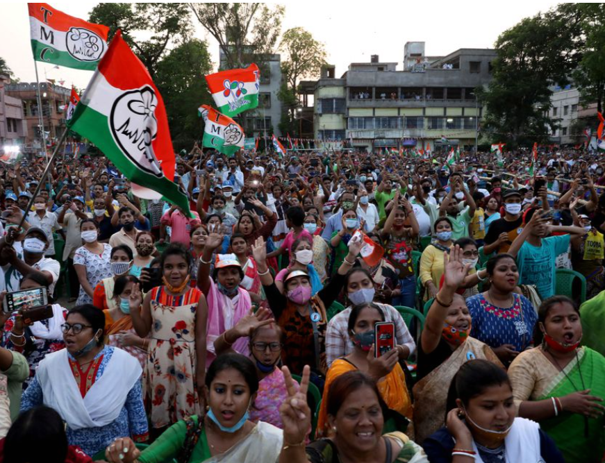Supporters of the Chief Minister of the eastern state of West Bengal and Trinamool Congress (TMC) Chief, Mamata Banerjee, attend an election campaign rally ahead of the fourth phase of the state election, amidst the spread of the coronavirus disease (COVID-19), in Kolkata, India, April 7, 2021. Picture taken April 7, 2021. Reuters/Rupak De Chowdhuri/File Photo