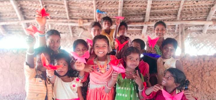 A group of Kuravar children excitedly display their origami creations at the children’s resource centre. Photo: Sukanya Roy