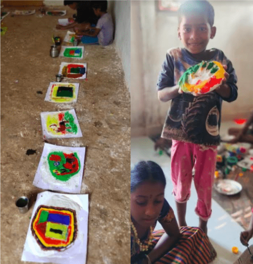 Priyadarshini was a girl from an “upper caste” who would typically not smile at or talk to Kuravar children, like most Savarna children. “In the workshops, we invite children from all castes to create art together. They share a paintbrush, sit next to each other and eat from one plate” said Pandiyan.