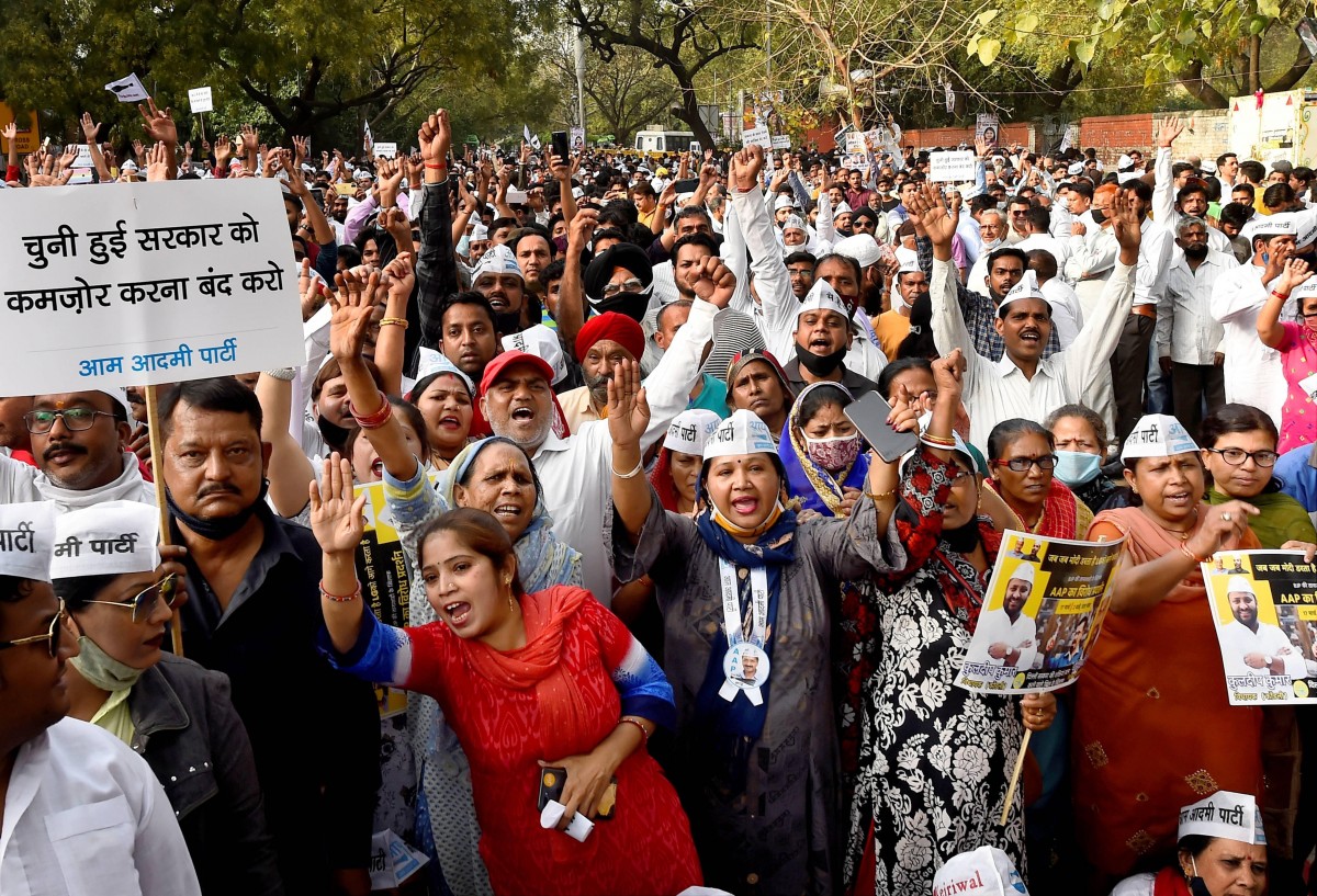 Aam Aadmi Party (AAP) activists stage a protest against the Government of NCT Delhi (Amendment) Bill 2021, at Jantar Mantar in New Delhi, Wednesday, March 17, 2021. Photo: PTI/Kamal Singh