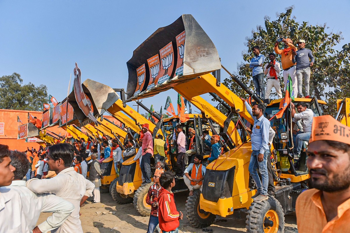 Supporters with earth-mover bulldozers attend a public meeting UP Chief Minister Yogi Adityanath (unseen) for the ongoing UP Assembly elections at Domariaganj village, in Sidharth Nagar, March 1, 2022. Photo: PTI