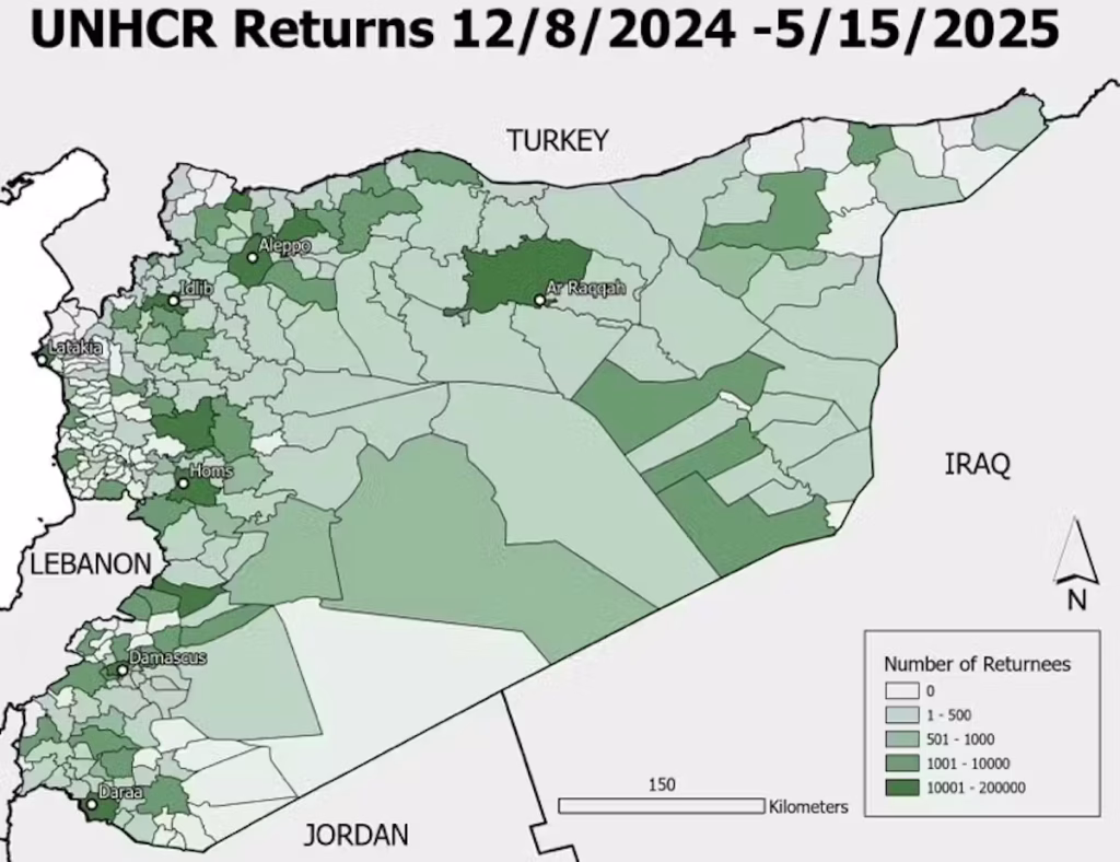 Map showing the number of UNHCR Returnees to different parts of Syria between December 2024 and May 2025, Photo: Sandra F. Joireman, CC BY-SA.