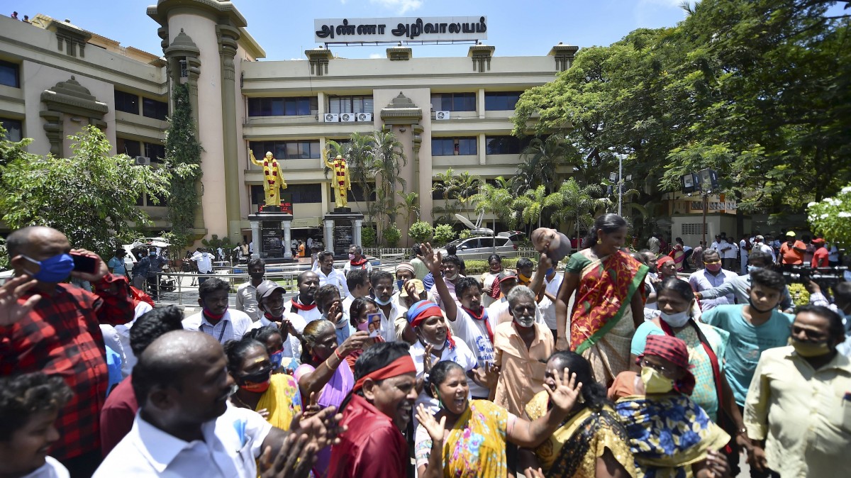 DMK Party workers celebrating during the counting of Tamil Nadu Assembly polls result at their party head quarters ,in Chennai, Sunday, May 2, 2021. Photo: PTI