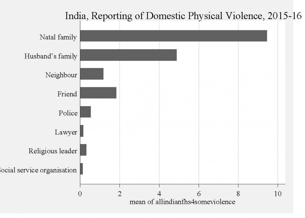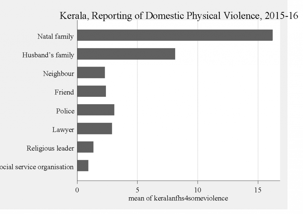 Resounding as the silence around domestic violence is for Kerala, it is still larger for many other parts of the country. The figure below shows that for India as a whole, the percentage of women in domestic violence situations who reach out to family and friends is only between half and two-thirds of the corresponding numbers for Kerala. Reporting to institutional sources, including the police, is far worse still, reaching only between a tenth and a fifth of Kerala’s already low levels.