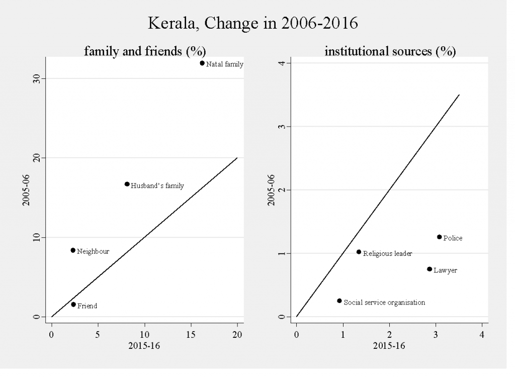 What has been the trend over time? When we compare data from two successive rounds of NFHS (2005-06 and 2015-16), the incidence of domestic physical violence in Kerala reduced only slightly over that decade, from 15.3% to 13.3%. But despite this, there were large changes in the patterns of reporting violence over the decade. The figure below plots reporting to family and friends (left graph) and institutions (right graph) in 2005-06 versus 2015-16. The 45-degrees line helps to gauge the extent of change over time: dots below the line indicate a higher value in 2015-16 and dots above the line indicate a higher value in 2005-06. The figure shows that incidence of reporting to family halved in Kerala over the decade – from 32% to only 16% for natal family and from 17% to only 8% for husband’s family.