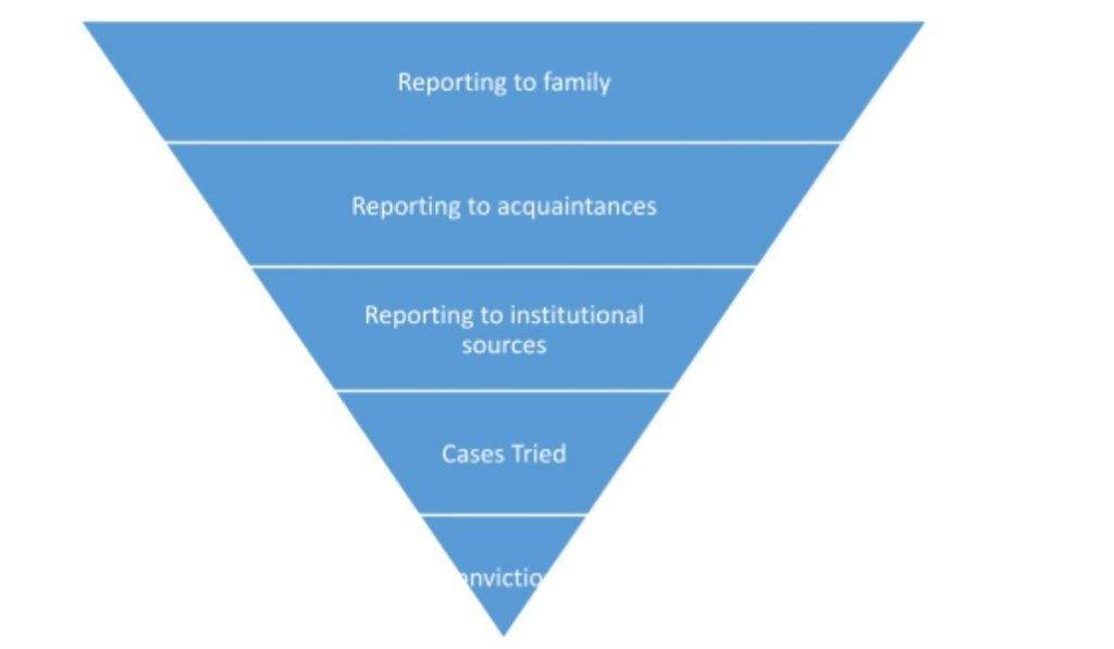 This reality is consistent with research suggesting a ‘pyramid of reporting’ (see figure below): among the few who share their experience of violence, most often it is shared first with the natal family, less often with in-laws, and still less with acquaintances. Reporting to institutions, such as the police or women’s organisations, is far less. An even smaller fraction of this gets to the court, and only a sliver gets convicted although there is a civil law (Protection of Women from Domestic Violence Act, 2005, PWDVA) and a criminal law (Section 498A) under which women can seek redress from courts.