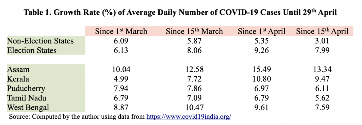 The only sliver of positive news is that the growth rate of daily confirmed cases has started declining in all the Election States (as can be seen from the last column in Table 1). This is likely the result of the election process winding down across the five states and the welcome, if belated, response by political and administrative leaders to the dangers of mass gatherings in the context of the pandemic. But this only further reinforces the basic hypothesis that election rallies contributed to the surge of COVID-19 cases in India and visited this enormous tragedy on the people of the country.