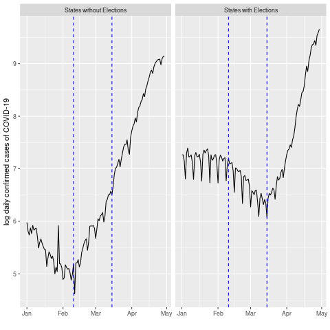 Once the surge of cases emerged in the Election States, it quickly overtook the average number in the Non-Election States. The first two rows of Table 1 presents the growth rate of the average number of daily COVID-19 cases in the two groups of states for four, increasingly recent, time periods: March 1 to April 29, March 15 to April 29, April 1 to April 29, and April 15 to April 29. From the numbers in Table 1, we can see growth rates diverging in the two groups of states from early March. Even as the growth rate was slowly declining in Non-Election States, from 6.09 to 5.87 to 5.35 to 3.01, it was rising in the Election States, from 6.13 to 8.06 to 9.26, before dipping a little since April 15 to 7.99. The divergent growth rates then led to a divergence in the level of average cases. By mid-April the average number of daily cases in Election States had overtaken the corresponding number in the Non-Election States (see Figure 1). Thankfully, the growth rate has started declining in recent days in Election States.