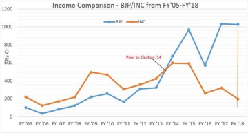 Comparison of income received by BJP and INC from FY 2005-06 to FY 2018-19.