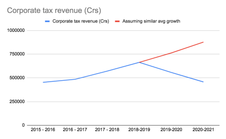 Assuming a similar growth of corporate tax revenue as previous years (~15%), the Union government, by reducing corporate taxes, has missed out on a potential revenue of Rs 6.27 lakh crore in the last two fiscal years (2019-20, 2020-21).