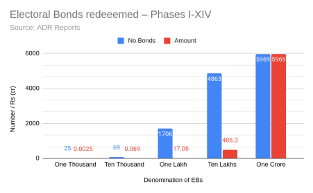 A breakup of the denominations of electoral bonds redeemed from phases 1-14. Source: ADR reports.