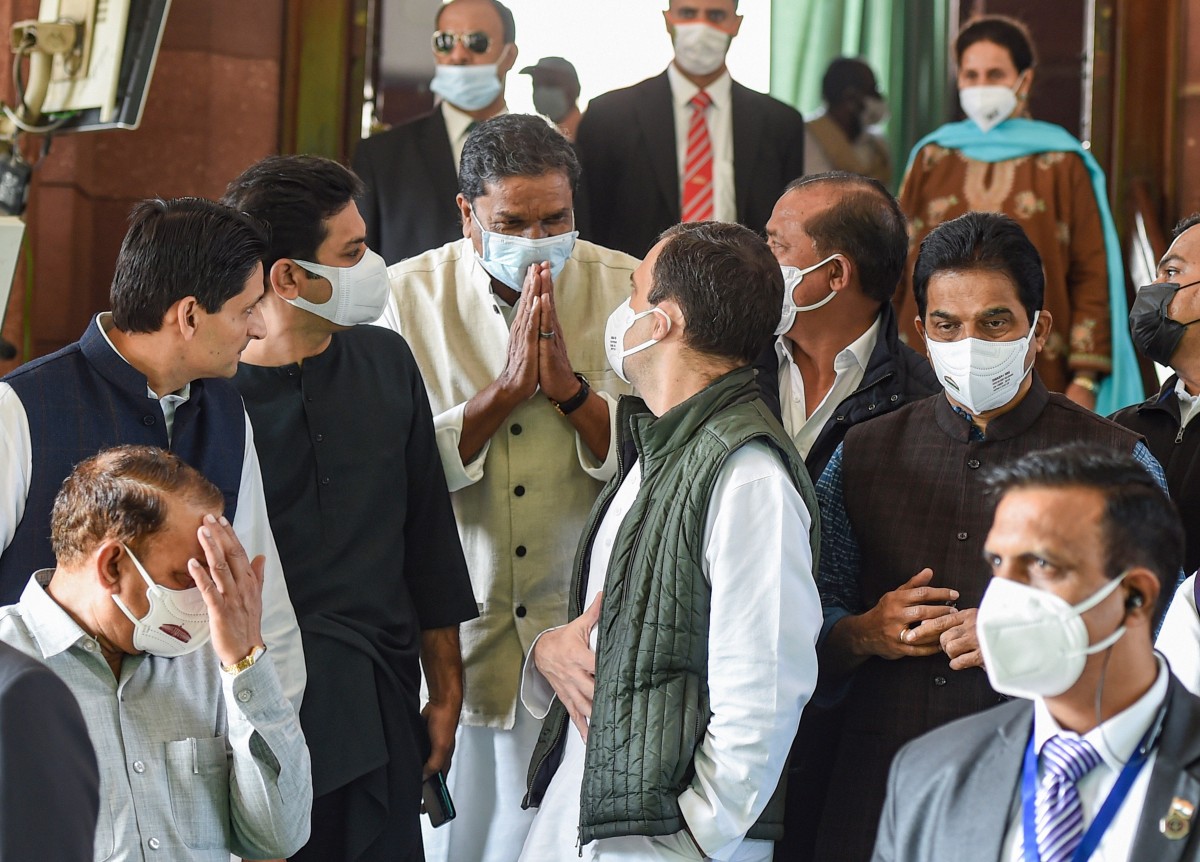 Congress leader Rahul Gandhi with party MPs during the Winter Session of Parliament, in New Delhi, Tuesday, December 7, 2021. Photo: PTI