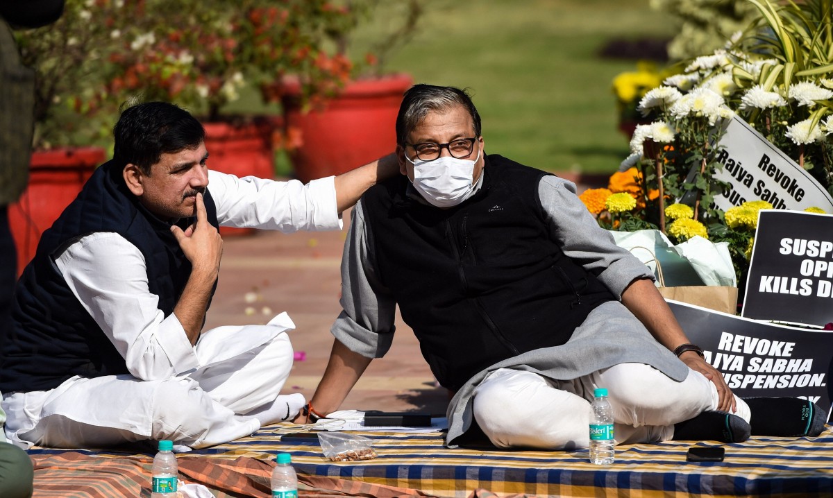 AAP MP Sanjay Singh and RJD MP Manoj Kumar Jha join suspended Rajya Sabha MPs who have been staging a protest dharna demanding revocation of their suspension, during the Winter Session of Parliament, in New Delhi, Tuesday, December 7, 2021. Photo: PTI