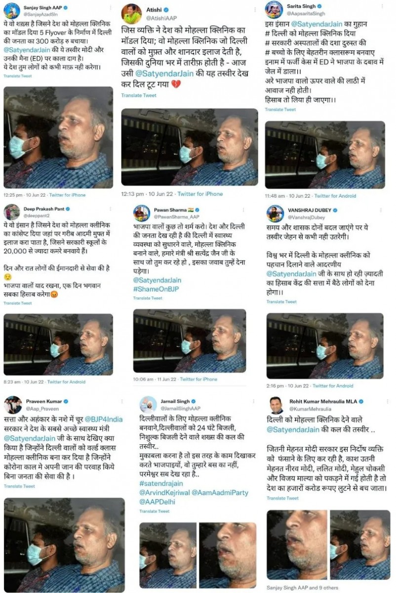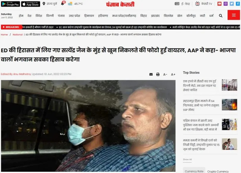 Punjab Kesari published a report in Hindi with the headline, “Photo of Enforcement Directorate-detained leader Satyendra Jain bleeding from the mouth viral, ‘God will hold everyone in the BJP accountable’ – AAP”. (Archive link)