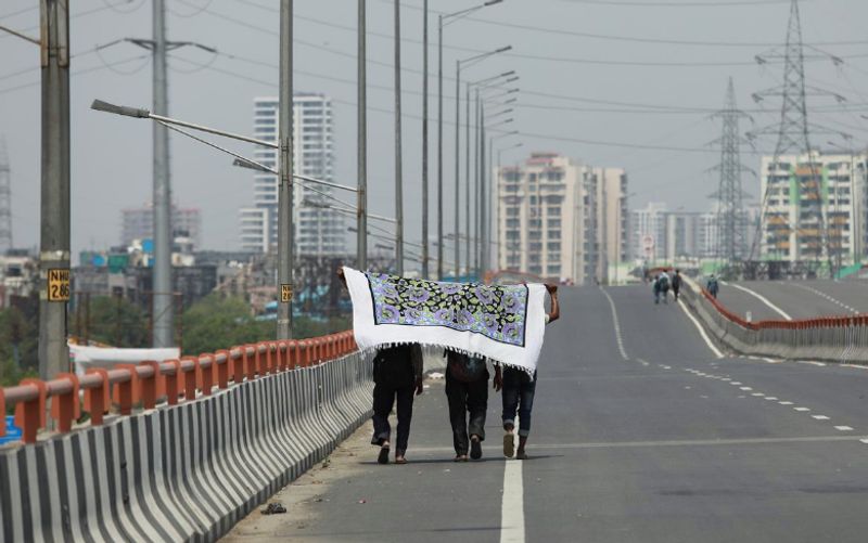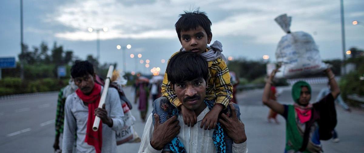A migrant worker carries his 5-year-old son on his shoulders as they walk along a road to return to their village, during a 21-day nationwide lockdown to limit the spreading of coronavirus, in New Delhi, India, March 26, 2020. Photo: Reuters/Danish Siddiqui.