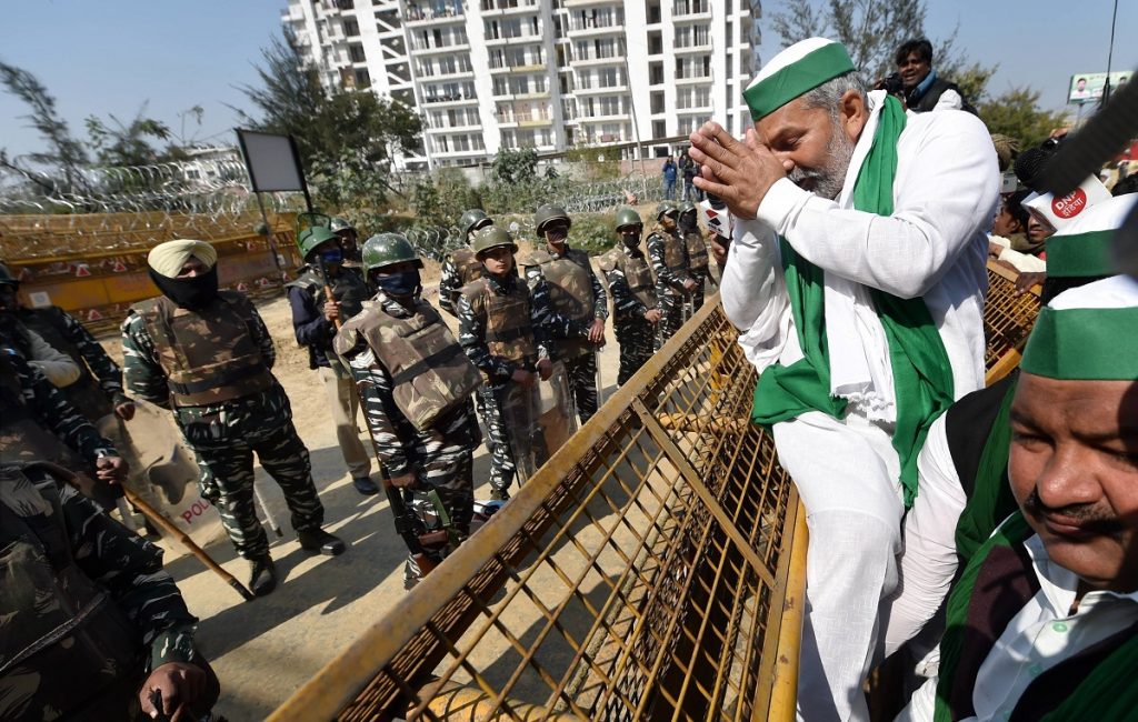 BKU spokesperson Rakesh Tikait gestures towards security personnel at Ghazipur border in New Delhi, February 6, 2021. Photo: PTI/Manvender Vashist