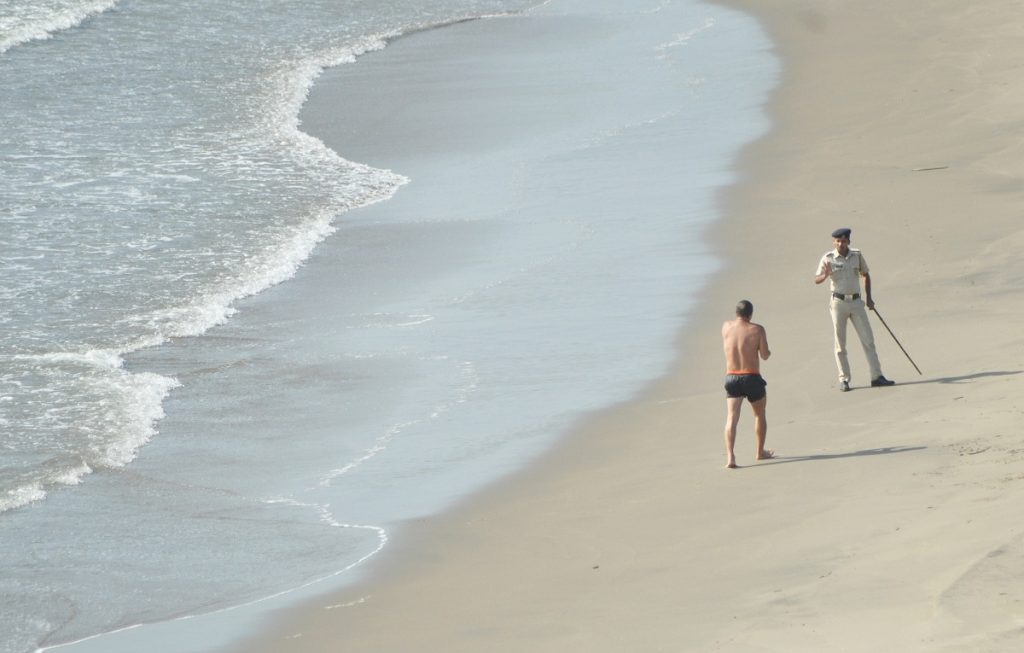 A Goa policeman chides a foreign tourist for violating the lockdown at Vagator beach last month. Photo Vincent Braganza