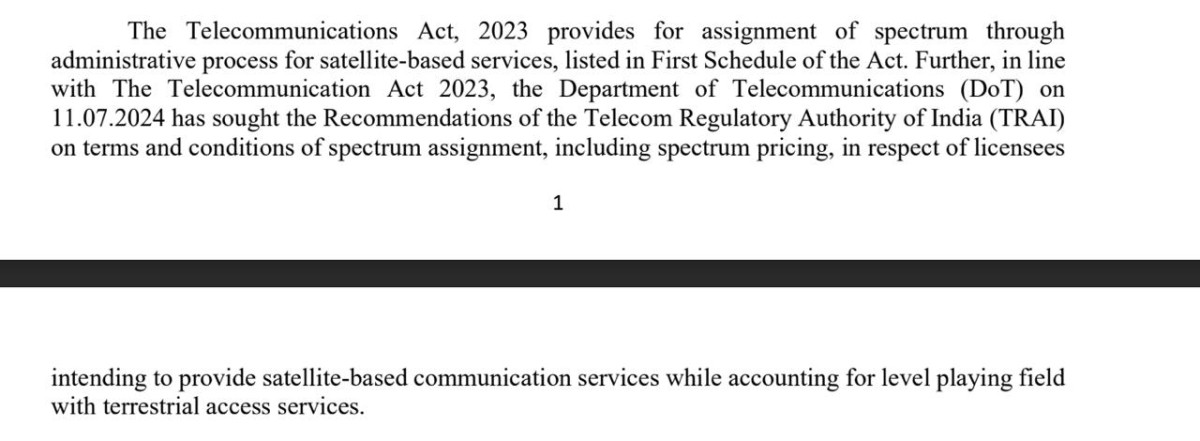 It is important to highlight that the Telecommunication Act 2023 “provides for assignment of spectrum through administrative process for satellite-based services, listed in the First Schedule of the Act”, as communicated by the government in parliament. This means that decisions can be made administratively rather than through an auction.
