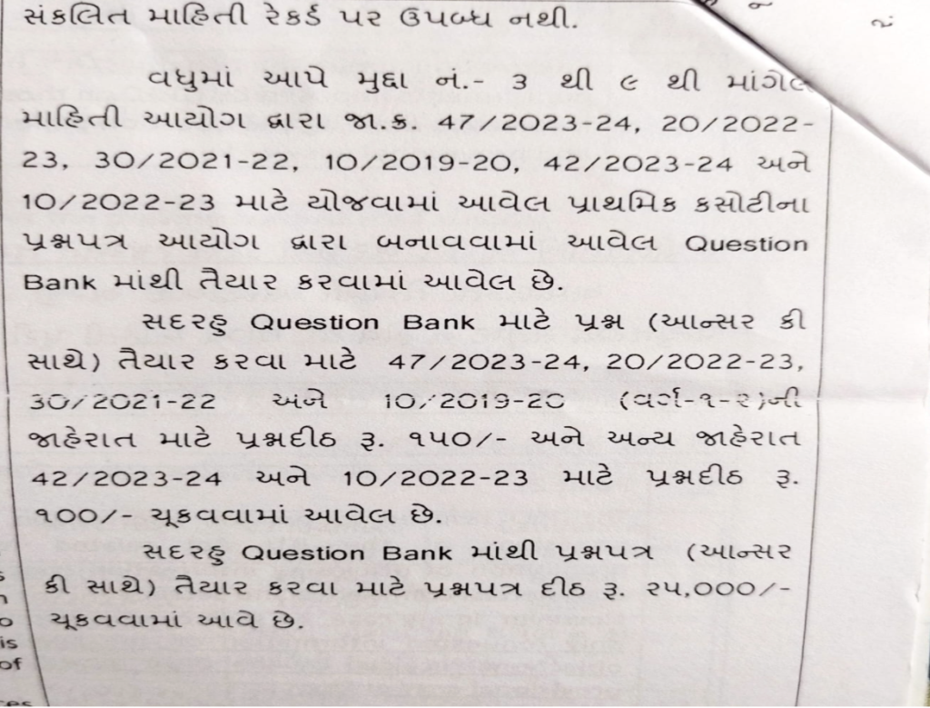 An RTI response I received from the GPSC in September 2024 revealed that the commission pays Rs 100 to Rs 150 per question and maintains a question bank for its exams. For selecting 200 questions with answers from this bank, GPSC spends Rs 25,000 per paper, totalling Rs 50,000 for the two papers in an exam. This means GPSC spends Rs 90,000 to Rs 1,10,000 to frame 400 questions and answers for a single exam.