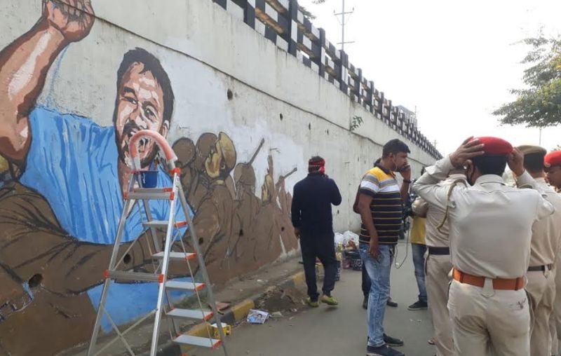 The mural – on the wall of a foot-overbridge at Bashistha – shows the incarcerated peasant leader being dragged by police.