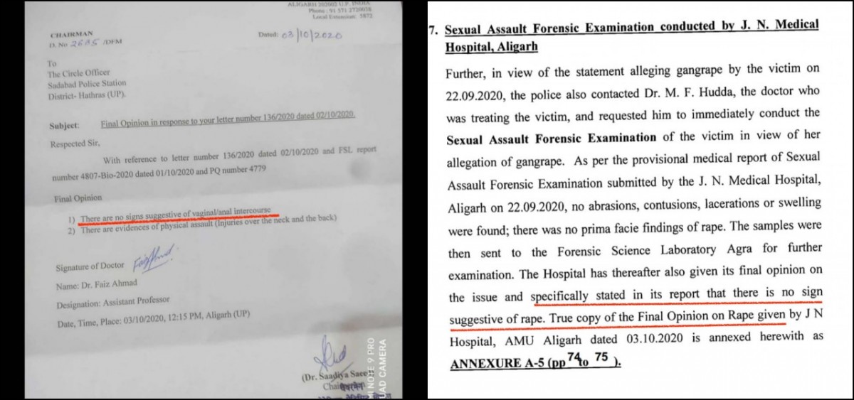 Letter from the Jawaharlal Nehru Medical College Hospital report (left); deliberate mischaracterisation of report in UP government affidavit, confusing penetration with intercourse and rape. (right).