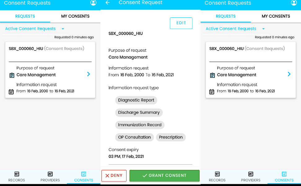 Now, if a ‘health information user’, such as an insurance agency, requests to view the patient’s radiology reports, this pop up on the consent manager application. She can then choose to share the reports with the agency for a designated period of time by ‘agreeing’ to do so on the app, as shown below.