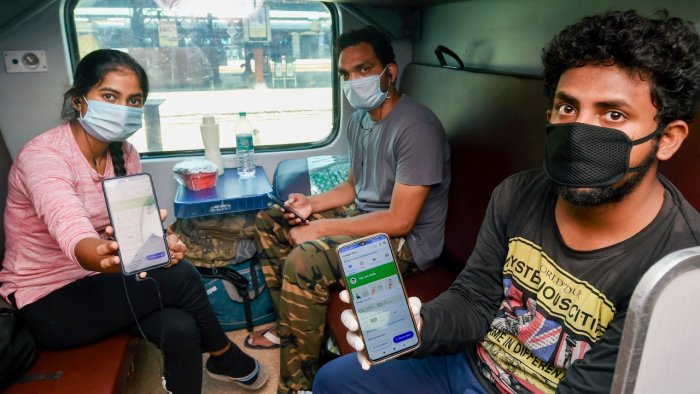 People show the Aarogya Setu app, installed on their phone, while on a train journey. Photo: PTI