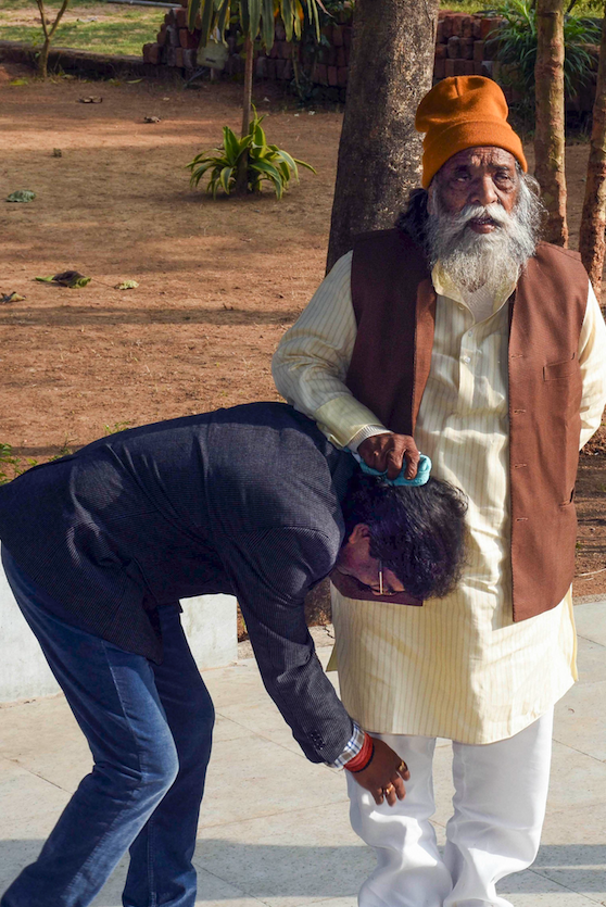 Hemant Soren bends down to take blessings from his father Shibu as the JMM-Congress-RJD combine led in the polls on December 23. Photo: PTI