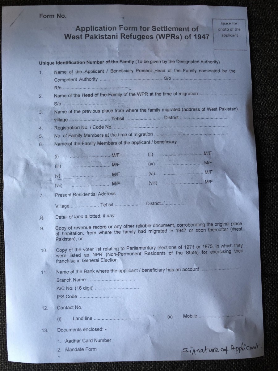 But the application form for the settlement of West Pakistani refugees still mandatorily requires them to attach other documents, which are obtained with much difficulty or are impossible to acquire, such as a legal heir certificate and succession certificate, a copy of revenue record or any other reliable document corroborating the original place of habitation (from where the family had migrated in 1947 or soon thereafter).