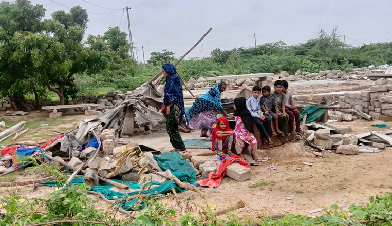 Ismail Chamadiya’s family members sit atop the debris of his demolished home in Bet Dwarka. Photo: Sabah Gurmat