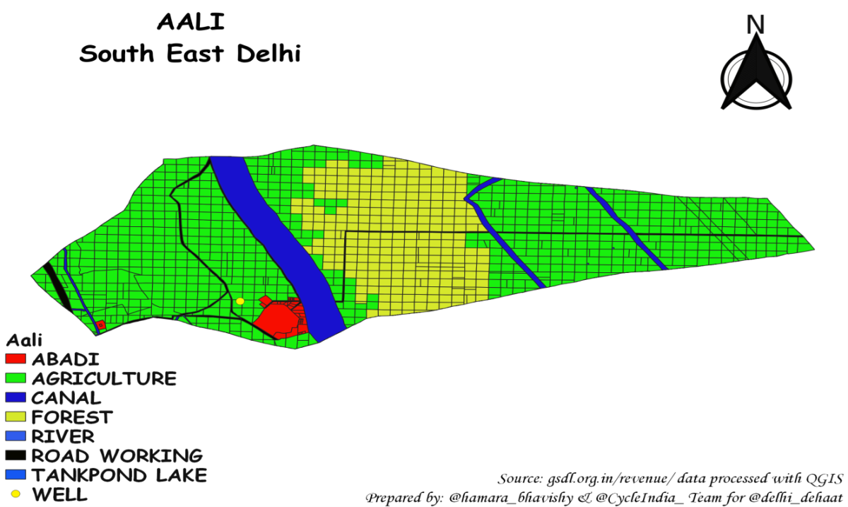 A colour-coded revenue map of Aali village, illustrating abadi, agricultural and other land-use areas. Source: Author's calculations and maps, based on GNCTD and DDA data.