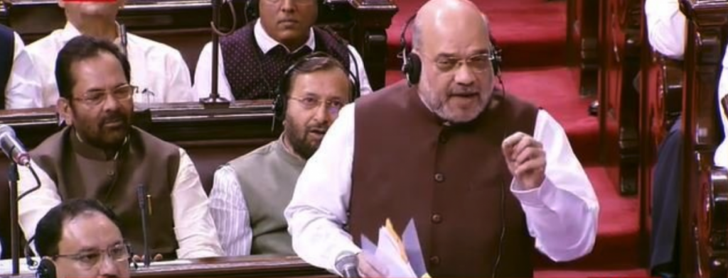 Union home minister Amit Shah delivers his speech in the Rajya Sabha on August 5. Photo: Twitter/@ANI