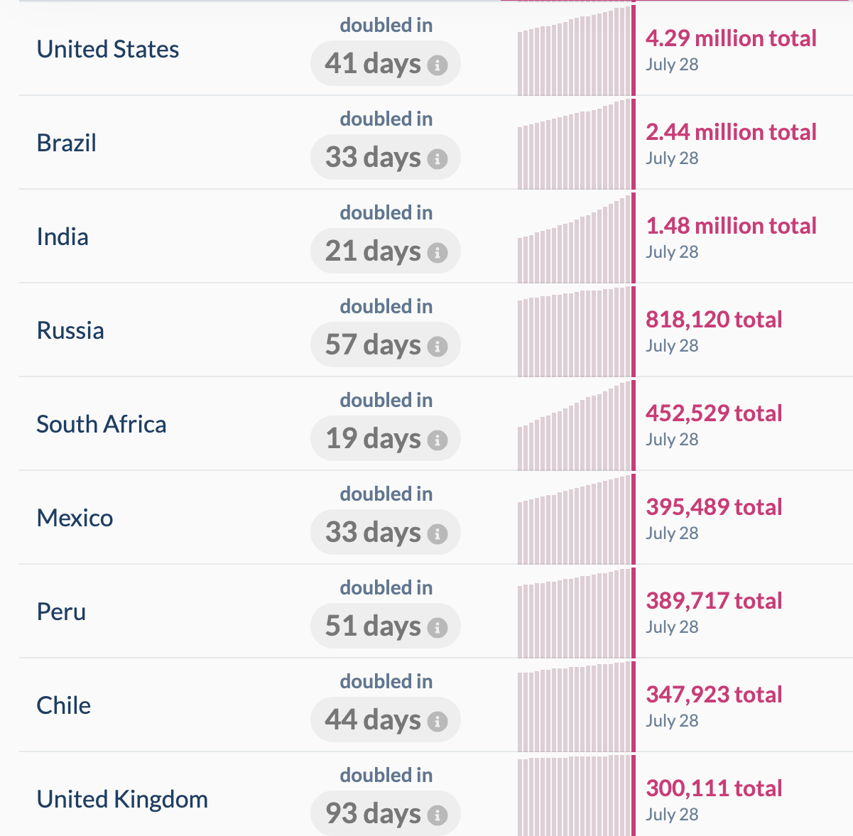 Consider the following chart, from 'Our World in Data', which gives the doubling time of cases for the countries with the highest case load:
