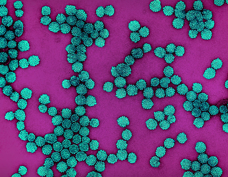 Colorized electron micrograph of HPV virus particles (teal) harvested and purified from cell culture supernatant. Captured at the NIAID Integrated Research Facility (IRF) in Fort Detrick, Maryland. Photo: NIAID/Flickr (CC BY 2.0).