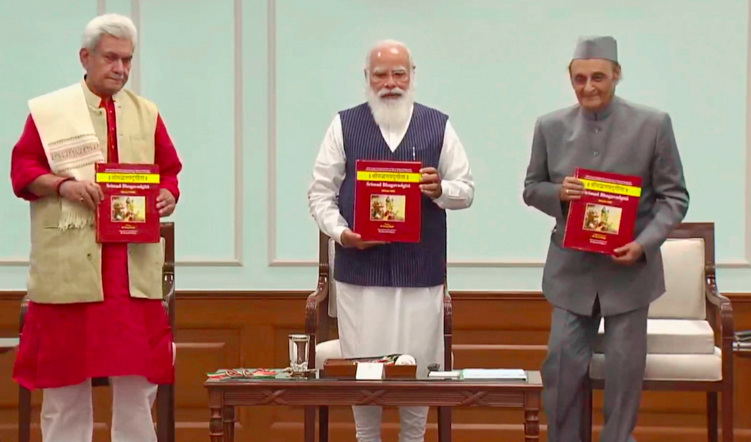 Prime Minister Narendra Modi with Jammu and Kashmir Lt Gov Manoj Sinha and senior Congress leader Karan Singh at an event on March 8 in Delhi. Photo: PTI