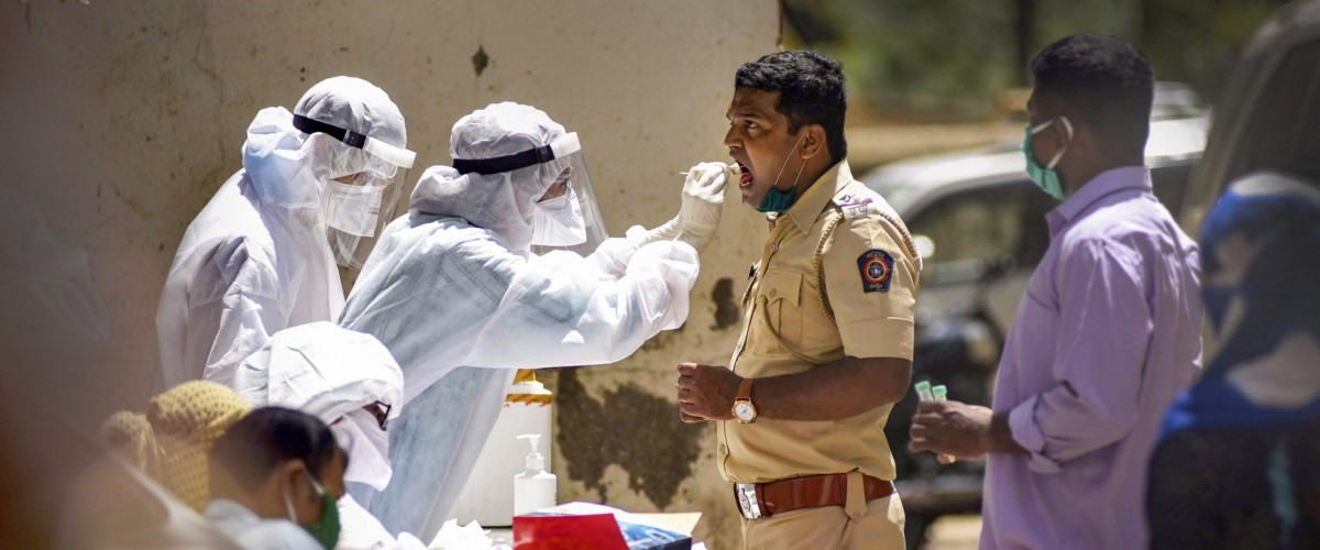 A medical team collects swabs from police personnel and their family members for COVID-19 tests at Yogi Nagar Police Quarters after a police inspector was found positive for the disease, in Borivali, Mumbai, Tuesday, April 7, 2020. Photo: PTI