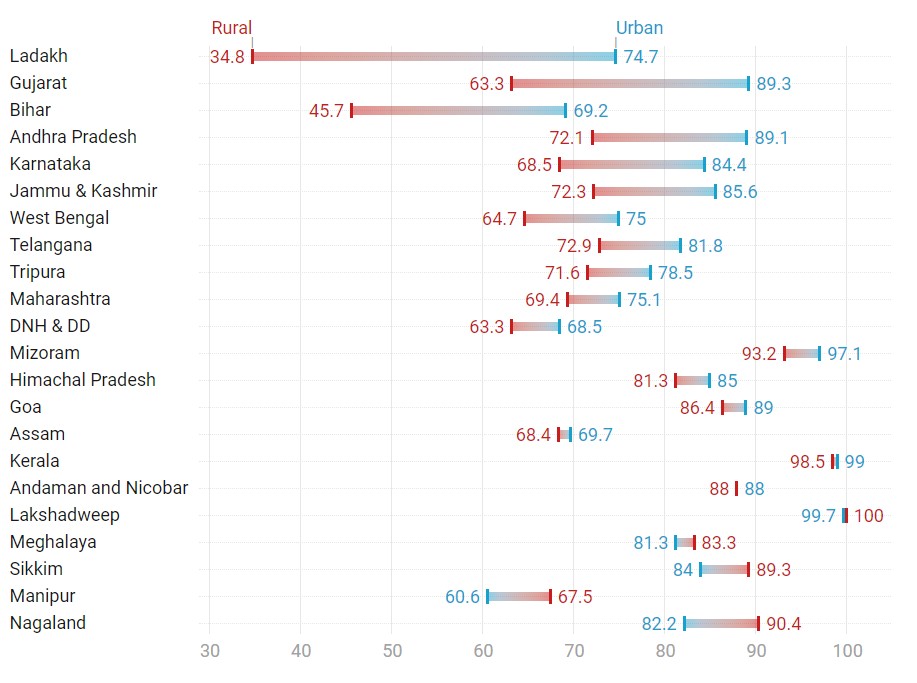 Rural sanitation has lagged behind urban sanitation in almost all states for decades. The only exceptions are north-eastern states like Meghalaya, Sikkim, Manipur and Nagaland, which exhibit an opposite trend as rural households have higher use of sanitation facilities than their urban counterparts.