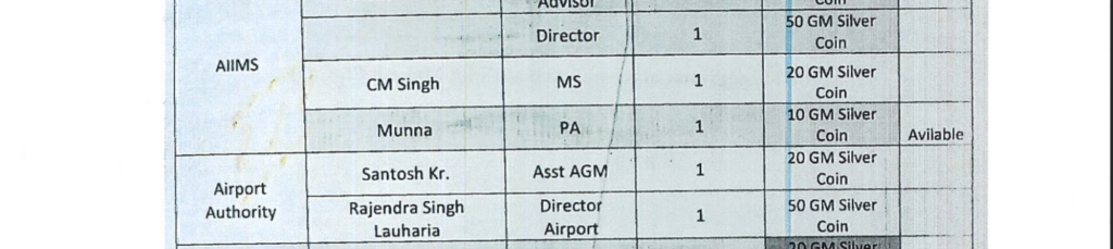 The Food Director received a gift of 100 grams of silver, the Managing Director of South Bihar Power Distribution Company Limited (SBPDCL) was given 10 grams of gold, and the CMD received 20 grams of gold. Several officials from Patna AIIMS are mentioned in these documents, including key figures such as the Financial Advisor and the Director, both of whom received 50 grams of silver.