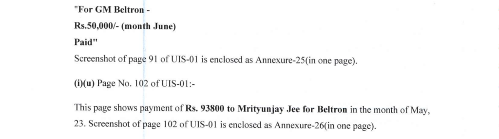 According to the Income Tax department, in July 2021, a payment of Rs 1 lakh was made to 'BELTRON Work (V)' and Rs 5 lakh to 'BELTRON'. Similarly, in May 2023, Rs 50,000 was recorded as being paid to the 'GM' and Rs 93,800 to 'Mrityunjay Jee'.