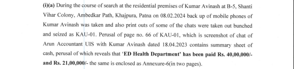 According to the Income Tax department, Kumar Avinash's company had secured the responsibility of the appointment of candidates on a contractual basis within government departments by offering bribes to officials. Documents from the Income Tax department show that Kumar Avinash provided cash and gold coins to health department officials on multiple occasions. On April 18, 2023, the executive director of the department at that time, Sanjay Kumar Singh, received two payments amounting to Rs 40 lakh and Rs 21 lakh. During his tenure as secretary of the department, Singh was also reportedly presented with a 10-gram gold coin as a gift.
