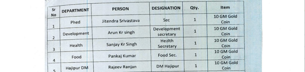 Officials from various departments, such as Public Health Engineering Department (PHED) secretary Jitendra Srivastava, development secretary Arun Kumar Singh (who is now deceased), food secretary Pankaj Kumar, and Hajipur District Magistrate Rajiv Roshan, were allegedly presented with 10-gram gold coins.