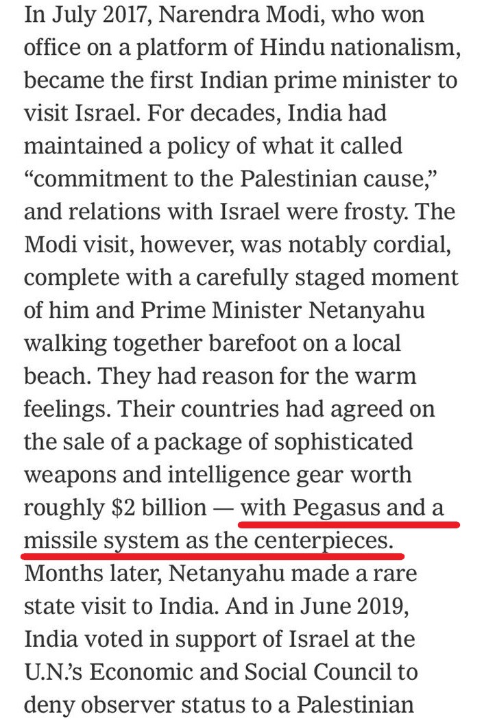 “Their countries had agreed on the sale of a package of sophisticated weapons and intelligence gear worth roughly $2 billion – with Pegasus and a missile system as the centerpieces. Months later, Netanyahu made a rare state visit to India.”