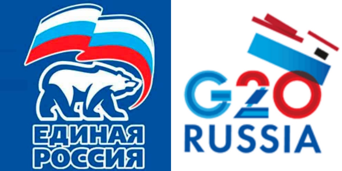 6. December 2012-November 2013: The presidency of the G20 was handed over to Russia from Mexico, and chaired by President Vladimir Putin of the United Russia Party. The colours in both logos are from the Russian flag.
