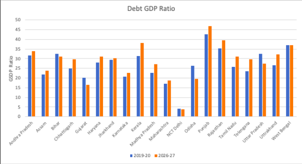 The graph above shows a change in the debt levels of the Gross State Domestic Product (GSDP levels) of states from the year 2019-20 to a projected analysis of debt-GDP ratios seen up until 2026-27.