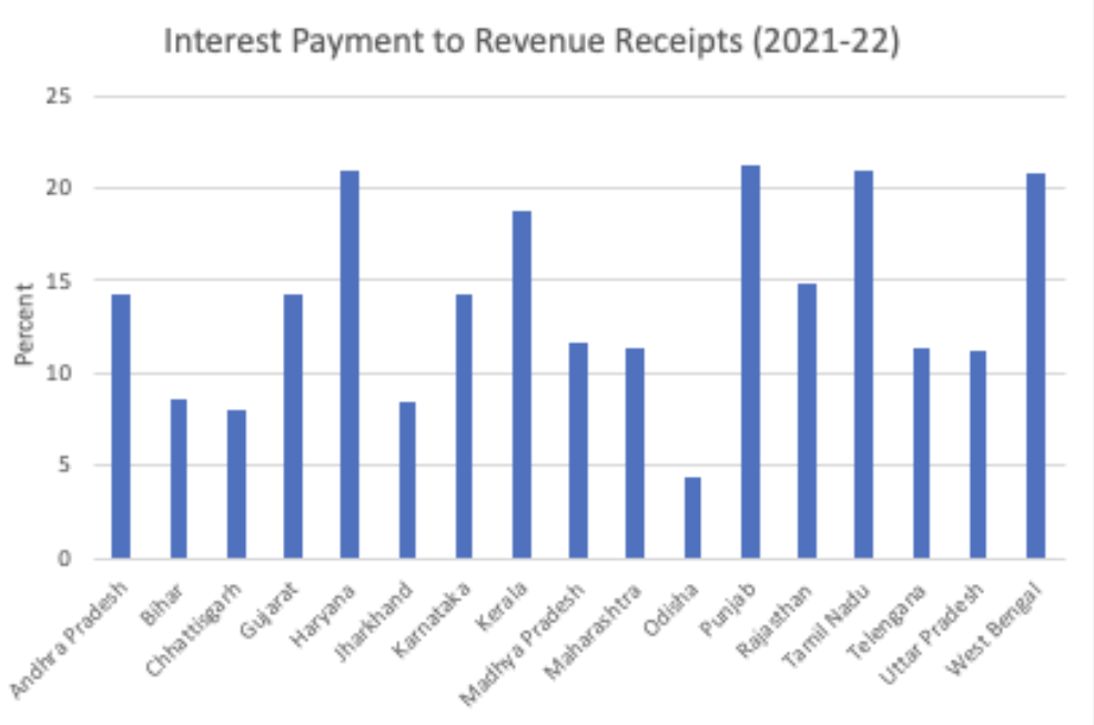 As evident from the graph, states like Punjab, Haryana, Tamil Nadu, and West Bengal had high percentages of interest payment (all in more than 20%), which indicates that these states are spending a large portion of their revenue expenditure interest payments, indicative of a heavy debt burden induced by greater borrowing.