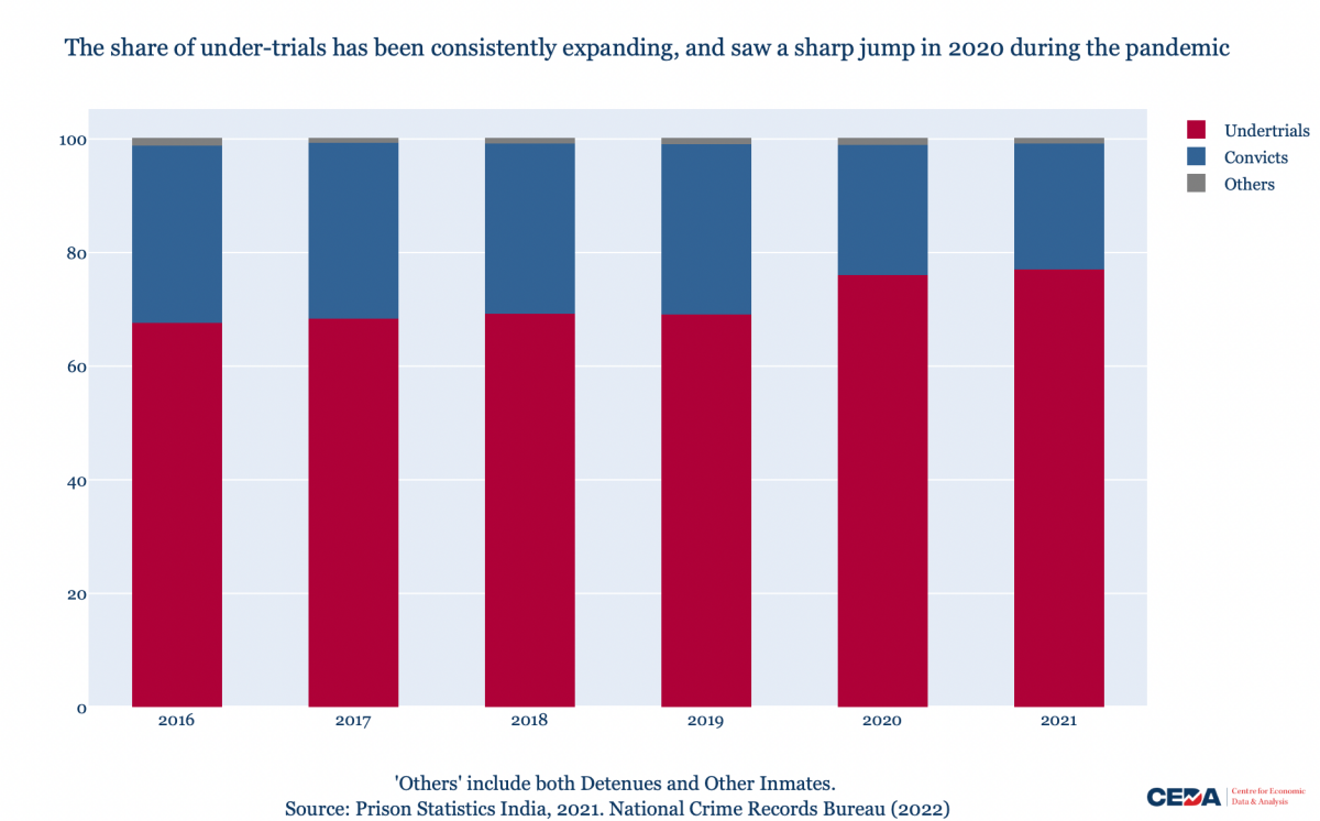 The share of under-trials has been consistently expanding, and saw a sharp jump in 2020 during the pandemic. Credit: Centre for Economic Data and Analysis