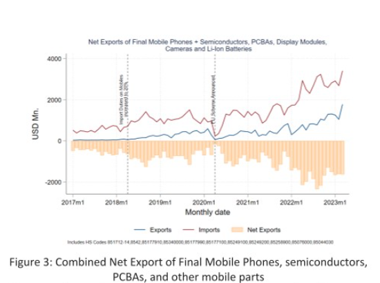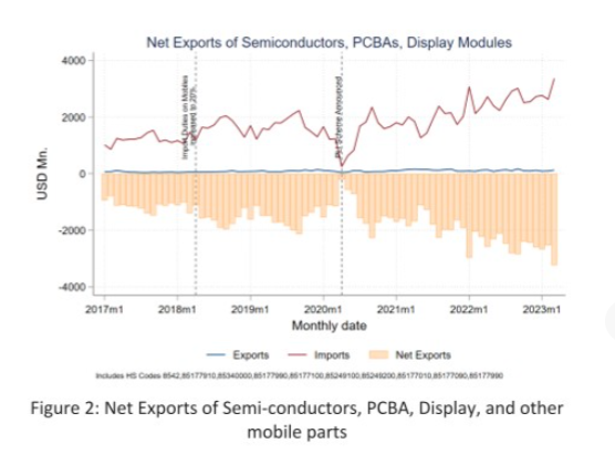 In Figure 3, it is assumed that 100% of imports of semiconductors, PCBAs, displays, li-ion batteries, battery chargers, and cameras go into mobile manufacturing. And since these components are used in other products as well, such as DSLR cameras, electric vehicles, etc., it may be possible that the increase in imports may be due to an increase in demand for these products.