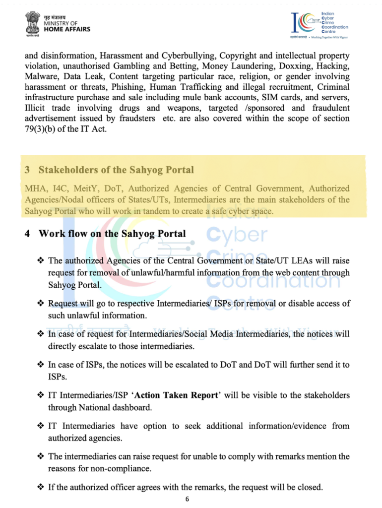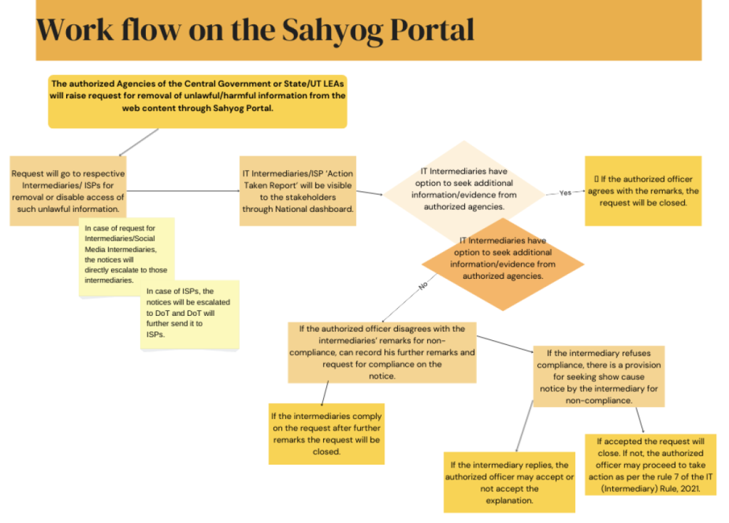The manual also provides a work flow on the Sahyog portal. Here it states that the authorised agencies of the central or state, or law enforcement agencies will raise a request for removal of unlawful/harmful information from the web content through Sahyog Portal. The request will then go to respective Intermediaries/ ISPs (Internet Service Providers) for removal or to disable access. In the case of request to Intermediaries/Social Media Intermediaries, the notices will directly escalate to those intermediaries, while in the case of ISPs it will be escalated to DoT and DoT will further send it to ISPs.